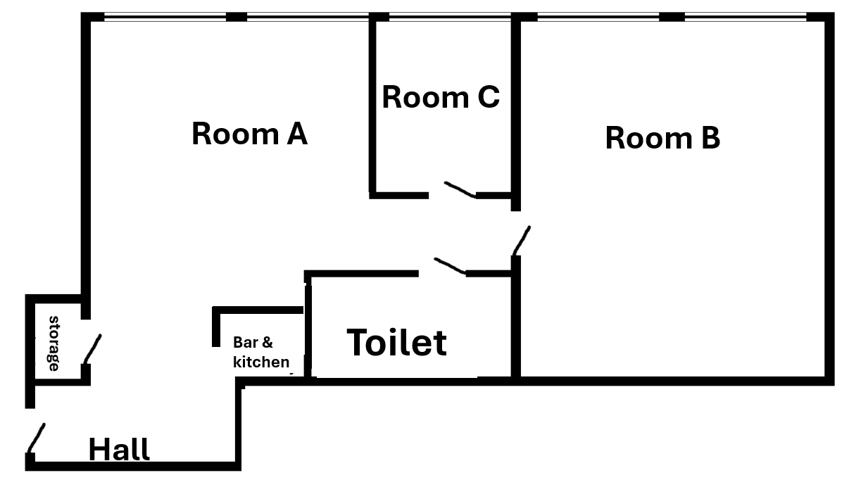 Lokalen består av två rymliga rum, kök och badrum, och rymmer upp till 35 personer. Här finns gott om plats för allt från energigivande aktiviteter till kreativa uttryck.